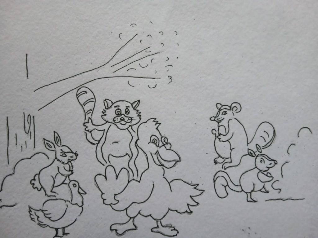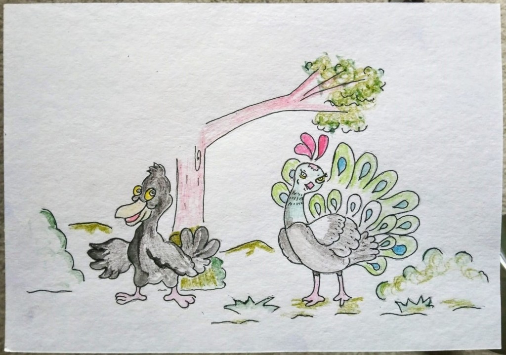 One day a Peacock was wandering in the forest in the mood to make some new friends. She met a Crow who asked the Peacock to be her friend. “No, you’re not as beautiful as me!” said the Peacock rudely. She went further on and met a Fox. The Peacock thought: “This fox is so handsome, he should be my friend.” The Fox caught the Peacock and said: “I’m going to eat you!” The Peacock cried out. The Crow heard her. He called his friends for help, they attacked the Fox and freed the Peacock. Afterwards the Peacock and the Crow became good friends.