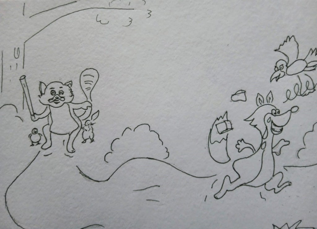 One day he made a big mistake. There was a hole in the fence and he escaped into the forest. Deep in the forest, he was so happy he burst out singing. A Fox heard him and came running to catch him and eat him. But the Rooster jumped up into a tree.